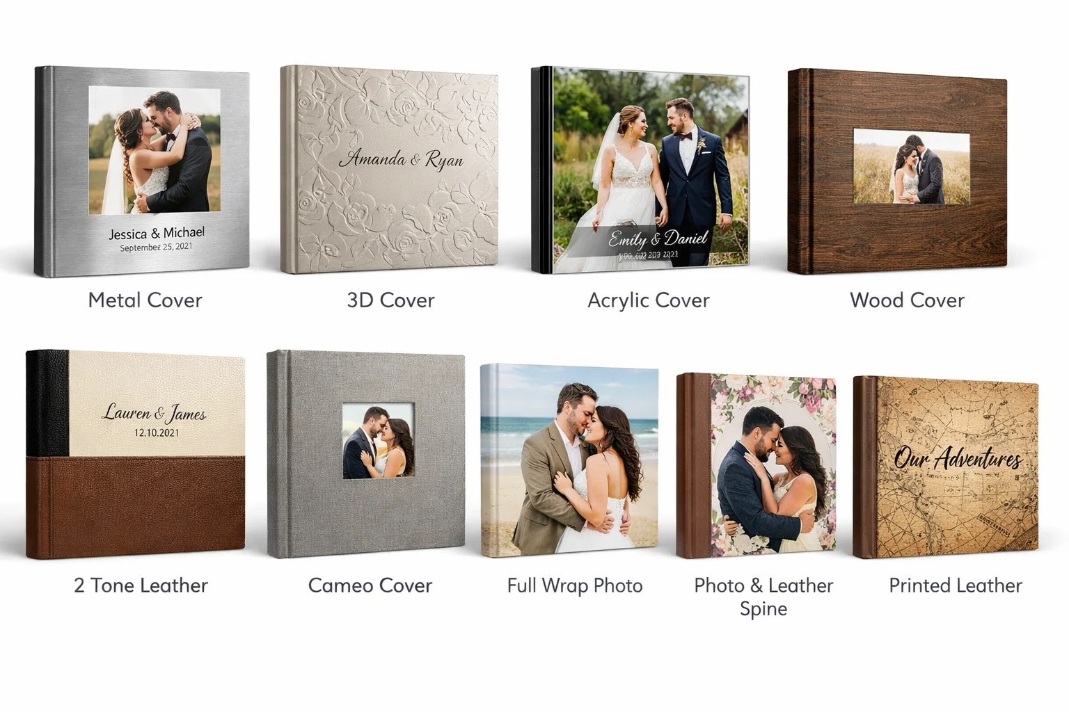 The Life In Light series is our most popular, premium line album. Flush mount albums originated as high-end wedding albums that were custom made by special handcrafters. Flush Mount albums have a stronger, tighter, finer & superior core. Flush mount albums differ from regular photo books by being hand mounted on thick inner substrate with thick white or black paper. Album cover options include Metal, 3D, Acrylic, Wood, 2 Tone Leather, Cameo, Full wrap Photo, Photo with Leather Spine, Full Leather, and Printed Leather.